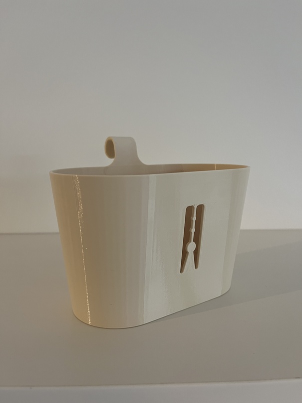 This basket can be hung on a bar with a diameter of 15 mm (0.59 inches) and can hold approximately 40 medium-sized pegs. It is printed in PETG.